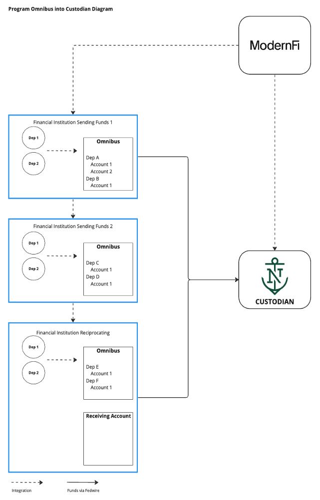 For institutions wanting to sweep deposits off-balance sheet or reciprocate deposits, a single program omnibus account is opened at the institution to facilitate the sweep. Deposits are swept from this program omnibus account into and out of the network of receiving institutions. Specifically, deposits are swept from the program omnibus account to a settlement account at ModernFi’s custodian, where they are then allocated to receiving institutions.